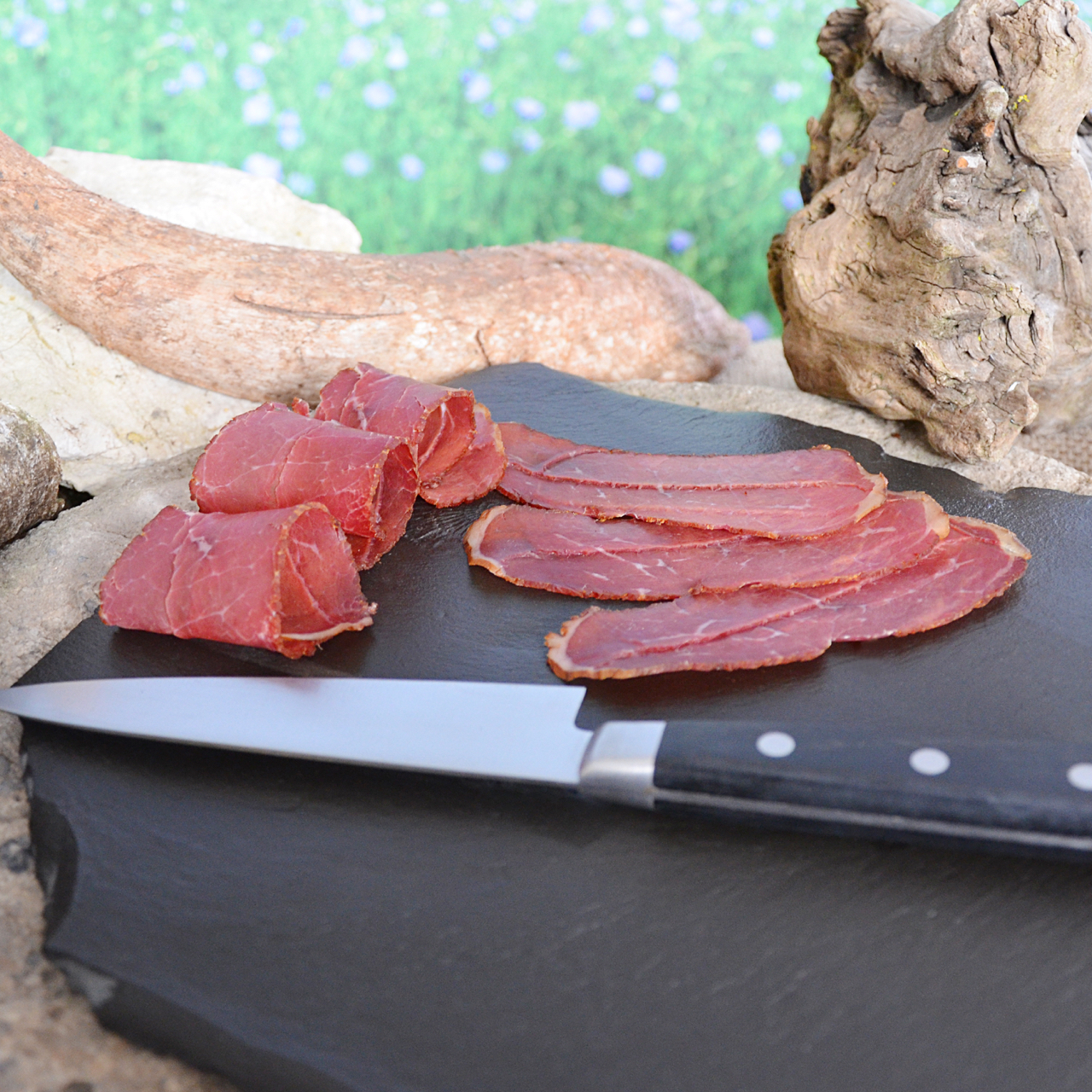 Rinderschinken aus Bioland Rindfleisch vom Orginal Allgäuer Braunvieh. Lufgetrocknet & kurz mild heißgeräuchert.