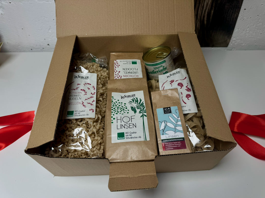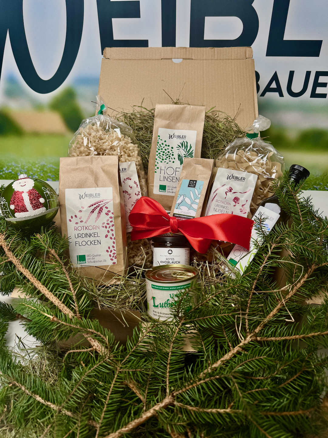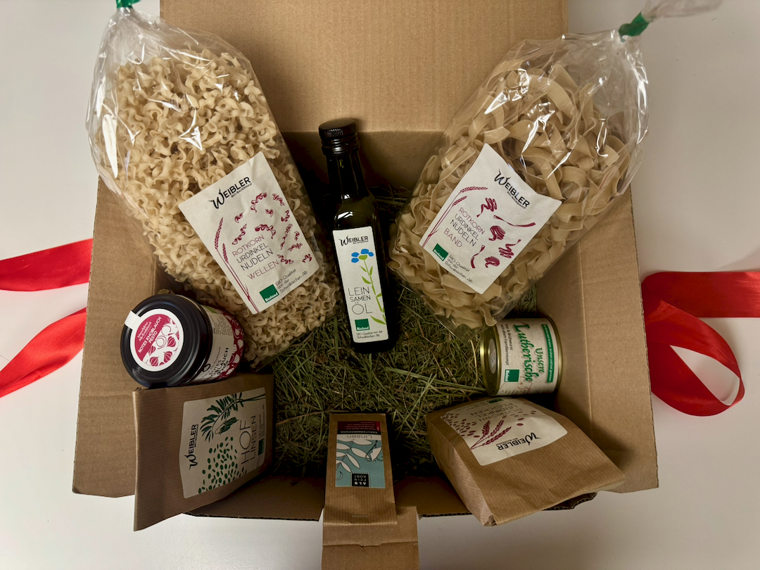 Ein Geschenk soll Freude machen – und im besten Fall auch zeigen, dass man sich wirklich Gedanken gemacht hat. Unsere Geschenksets vereinen hochwertige Lebensmittel aus eigener ökologischer Landwirtschaft zu besonderen Genussmomenten. Alle Produkte stammen aus einem geschlossenen Betriebskreislauf, der mit artenreichem Grünland, schonender Bewirtschaftung und traditioneller Handarbeit arbeitet. Das Ergebnis sind Lebensmittel, die ehrlich, transparent und authentisch sind – und genau deshalb als Geschenk so gut ankommen. Das Weihnachts-Geschenkset wird schonend mit eigenem Heu von unserem artenreichen Grünland verpackt.